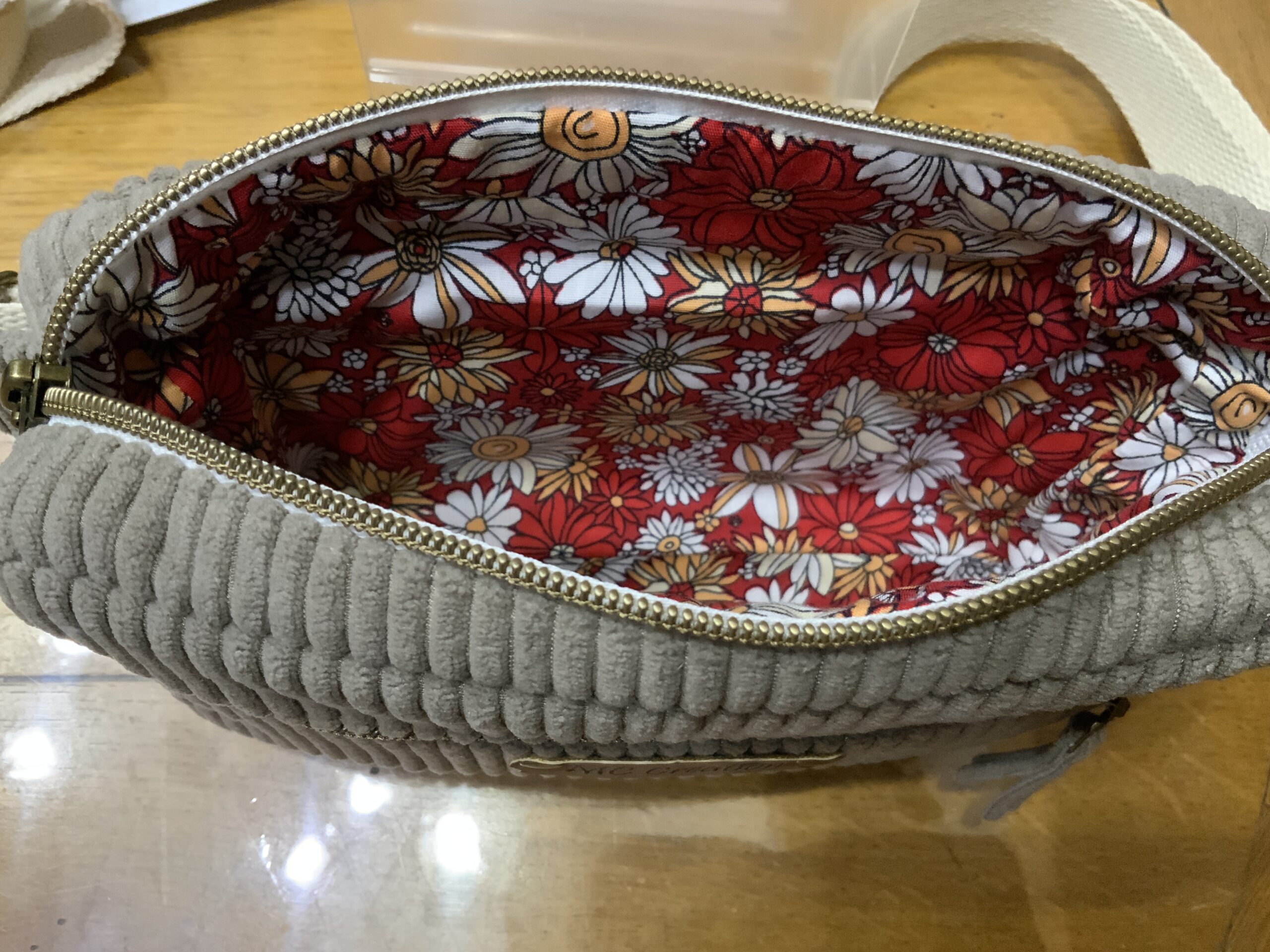 En velours côtelé taupe tissus extérieur et doublée coton imprimé marguerites blanches sur fond rouge.